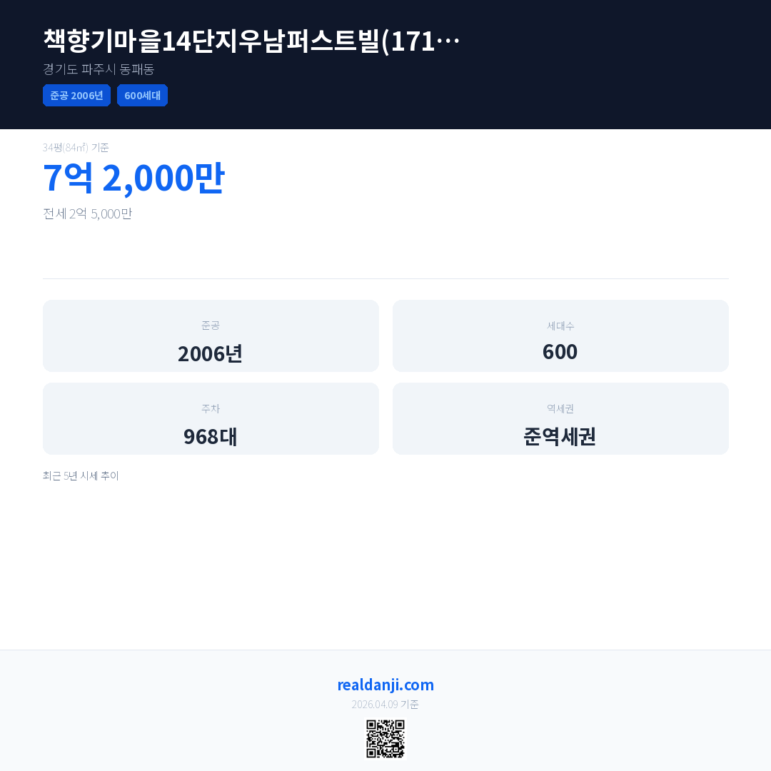 책향기마을14단지우남퍼스트빌(1711) 최근 거래가는 7억 2,000만입니다. (2026-03)