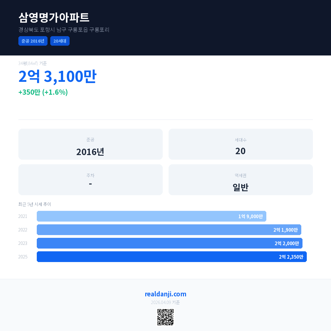 삼영명가아파트 최근 거래가는 2억 3,100만입니다. (2025-10)
