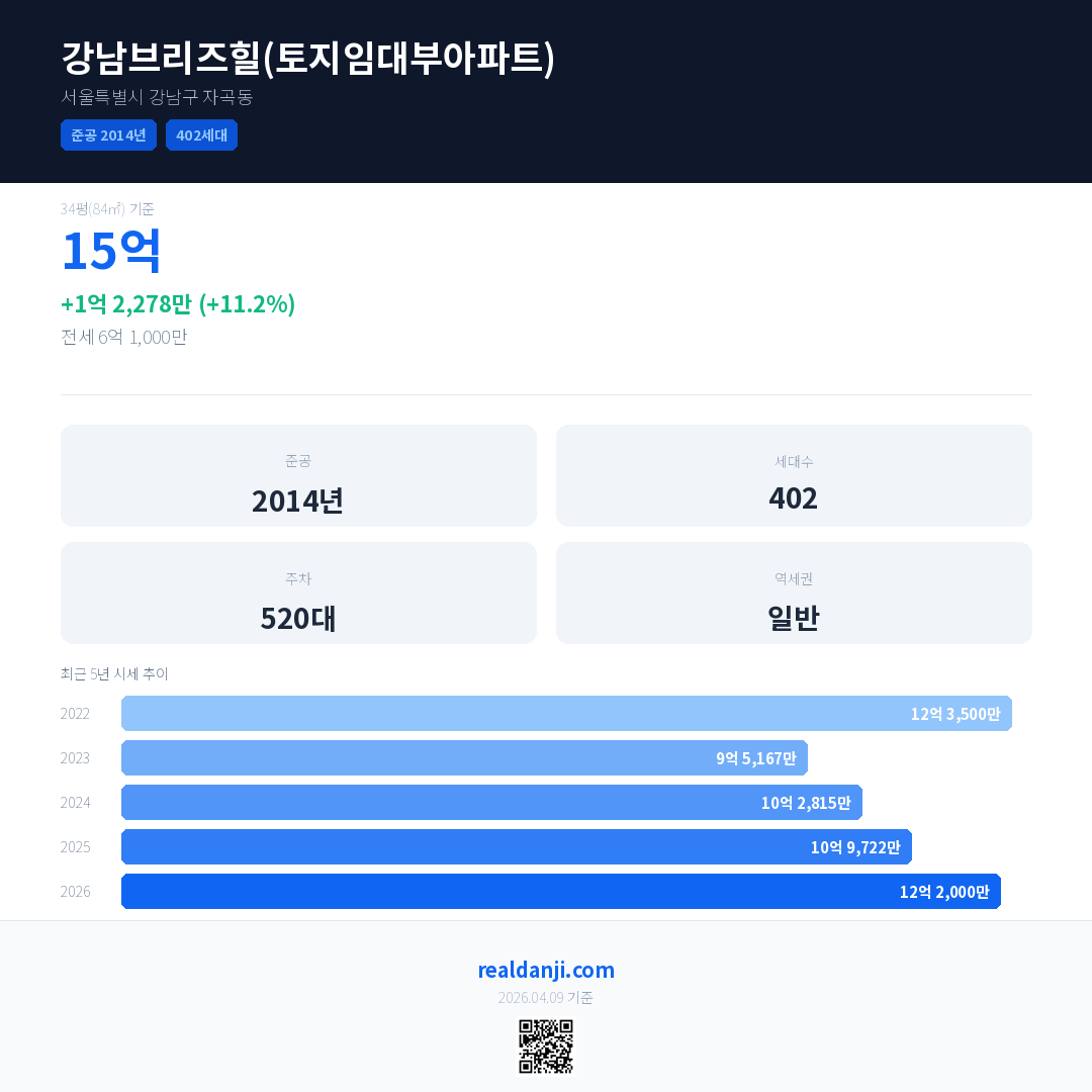 강남브리즈힐(토지임대부아파트) 최근 거래가는 15억입니다. (2026-01)