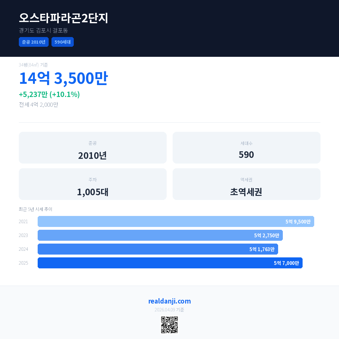 오스타파라곤2단지 최근 거래가는 14억 3,500만입니다. (2026-01)