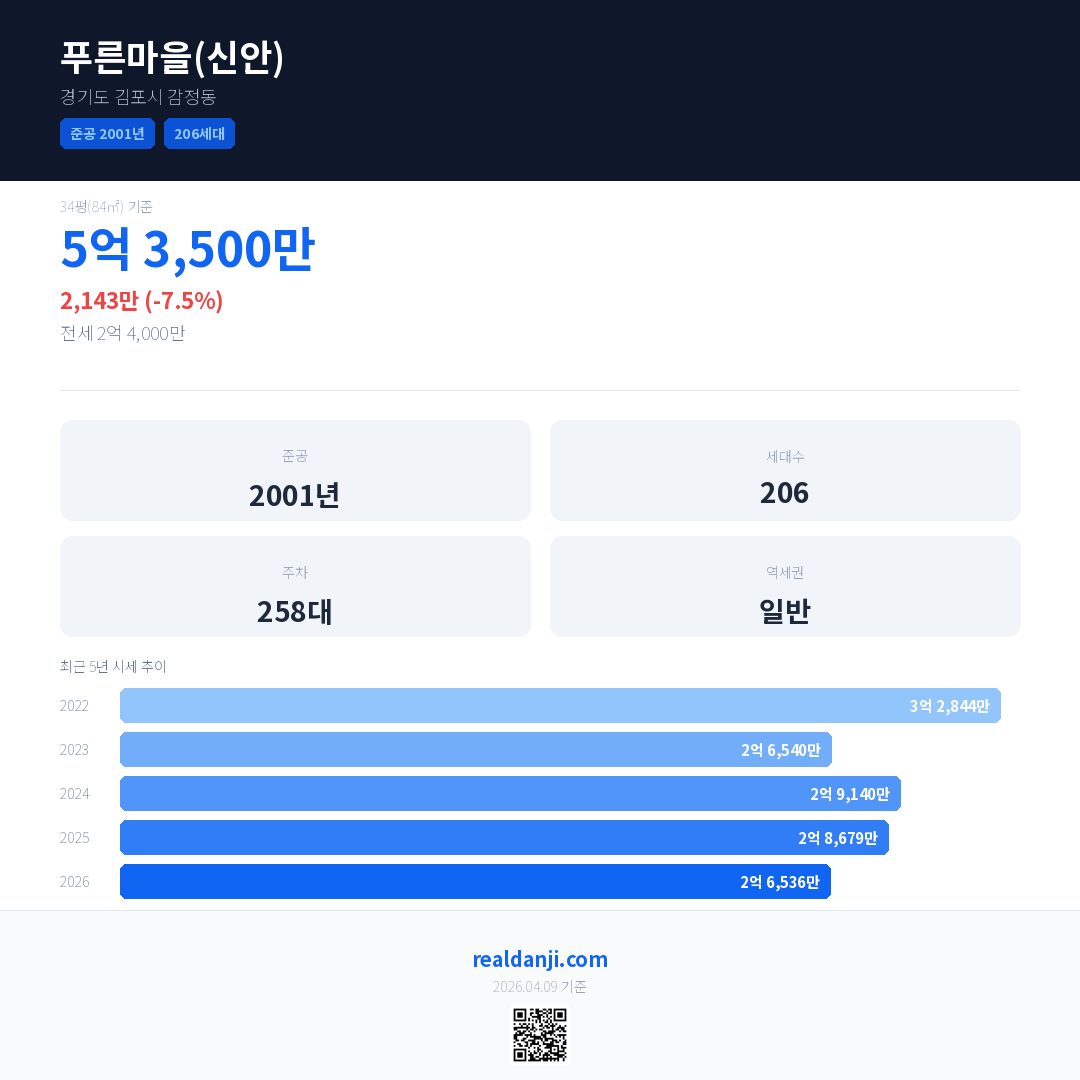 푸른마을(신안) 국민평형 기준 2026년 평균 거래가는 2억 6,536만으로, 전년 대비 7.5% 하락 했습니다.