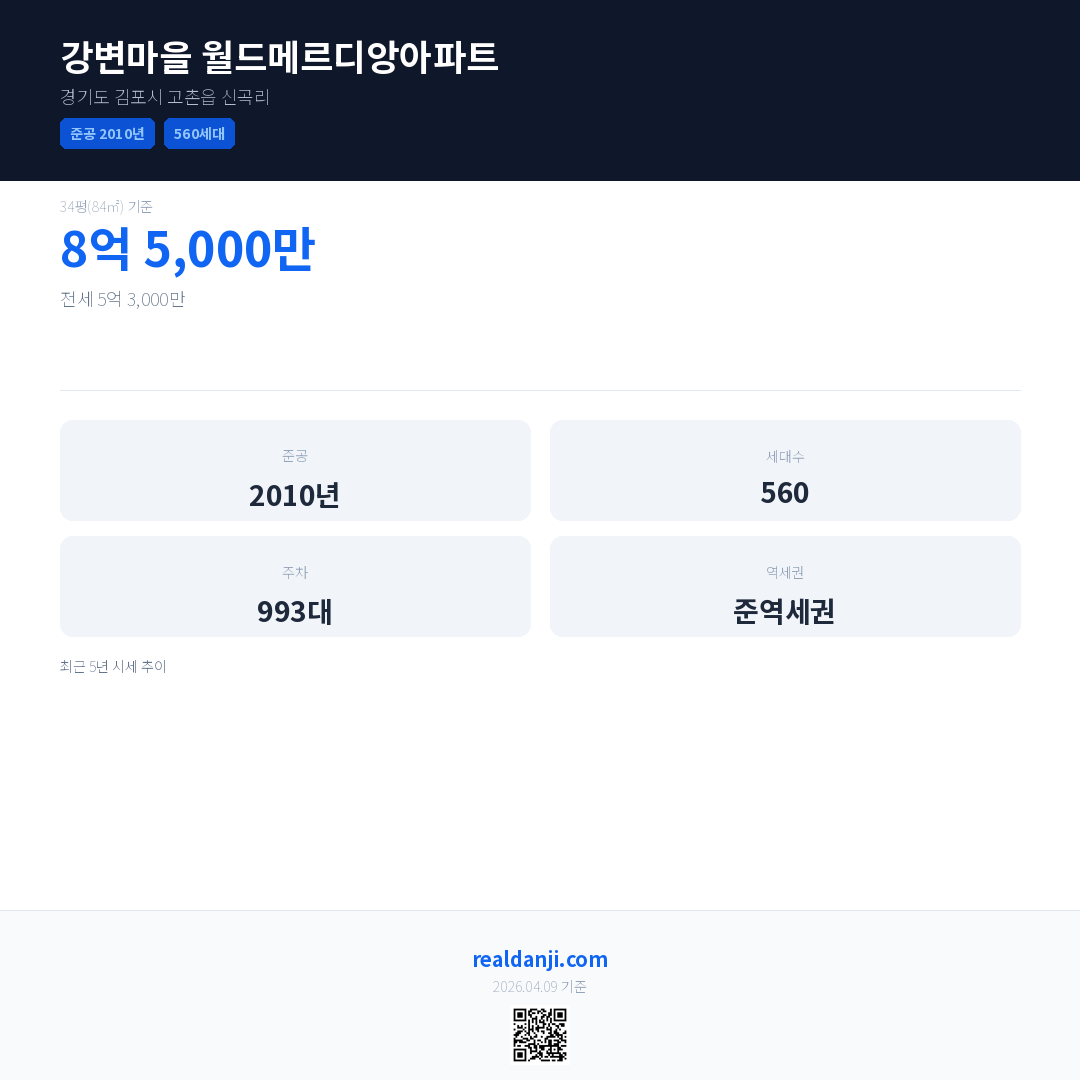 강변마을 월드메르디앙아파트 최근 거래가는 8억 5,000만입니다. (2026-02)
