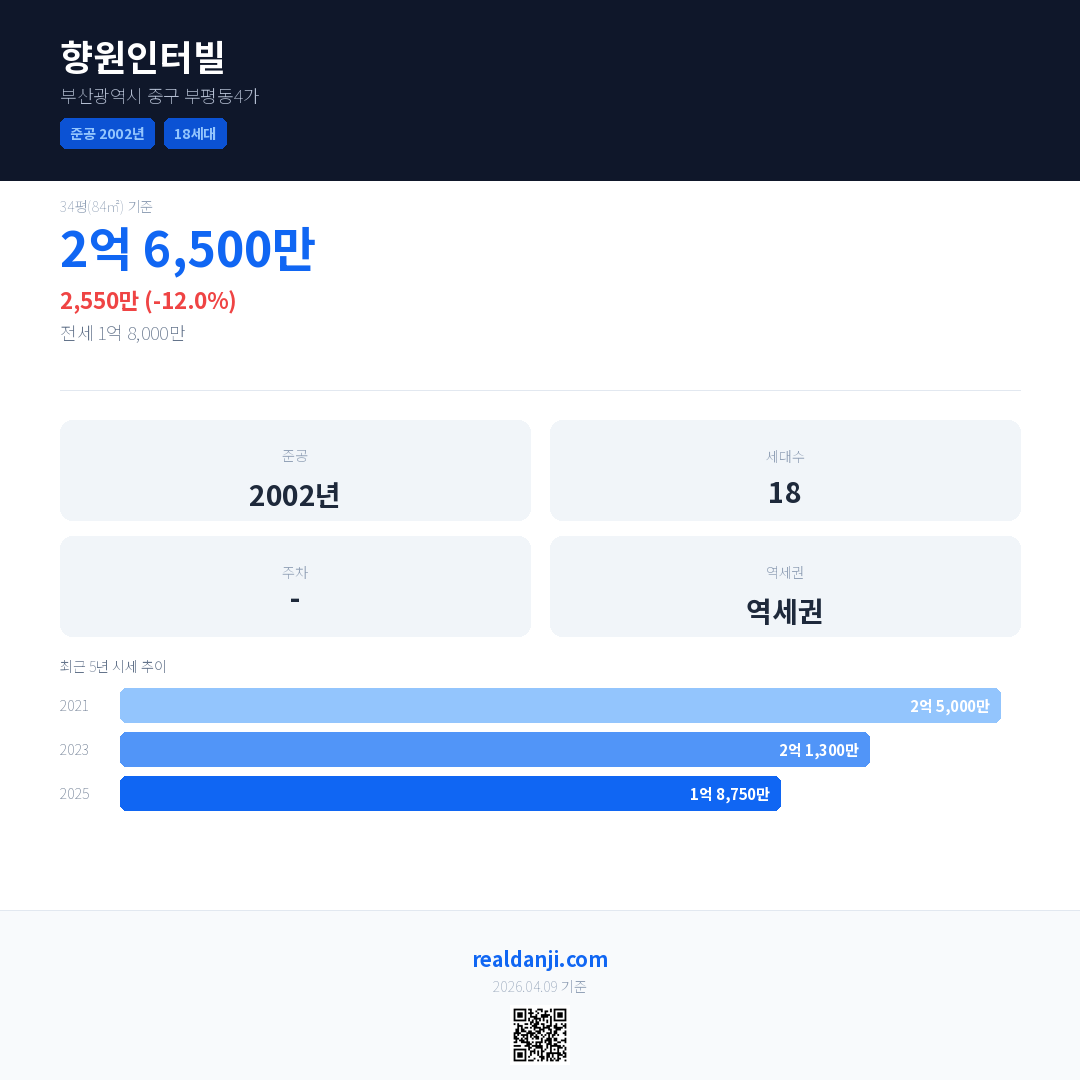 향원인터빌 국민평형 기준 2025년 평균 거래가는 1억 8,750만으로, 전년 대비 12.0% 하락 했습니다.