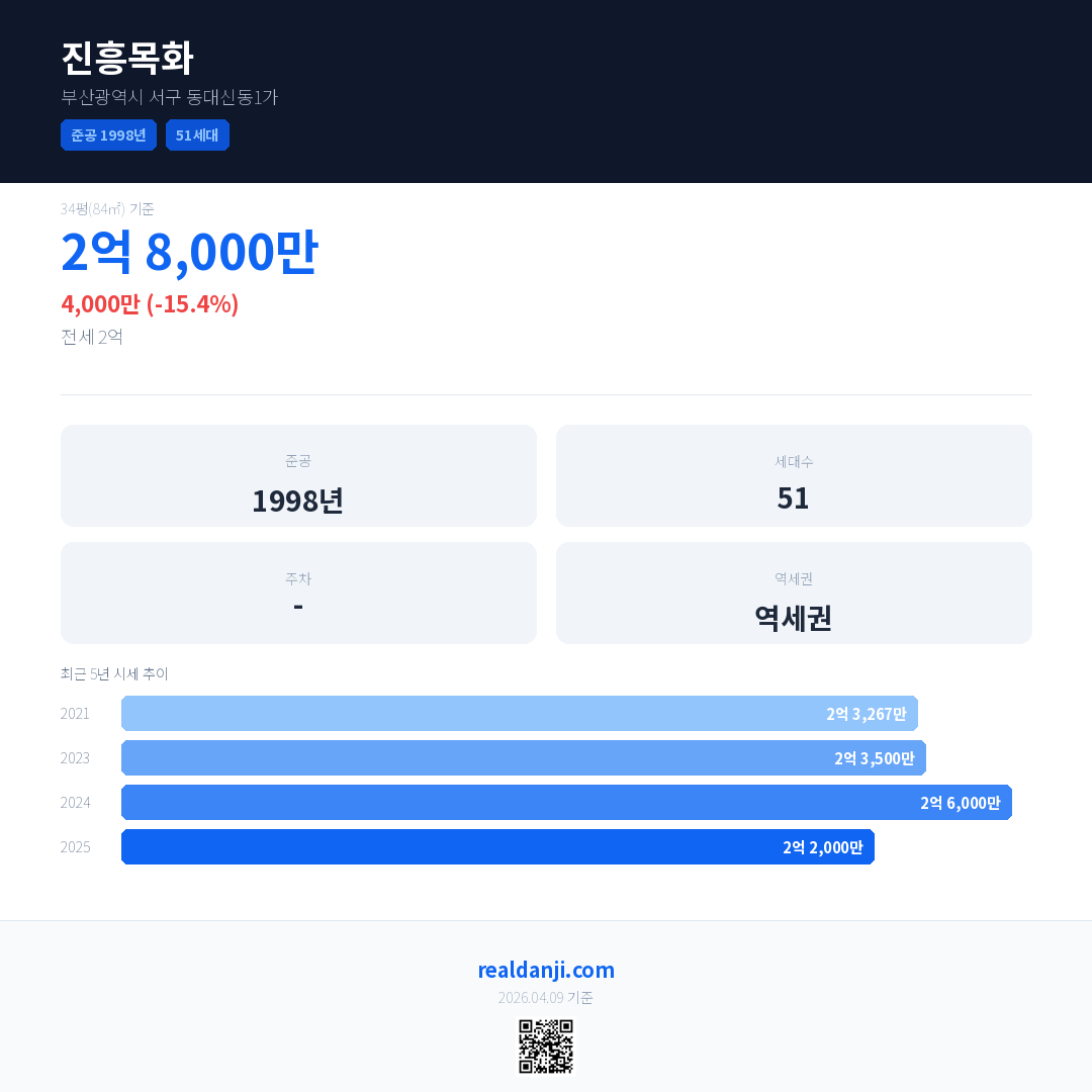 진흥목화 국민평형 기준 2025년 평균 거래가는 2억 2,000만으로, 전년 대비 15.4% 하락 했습니다.