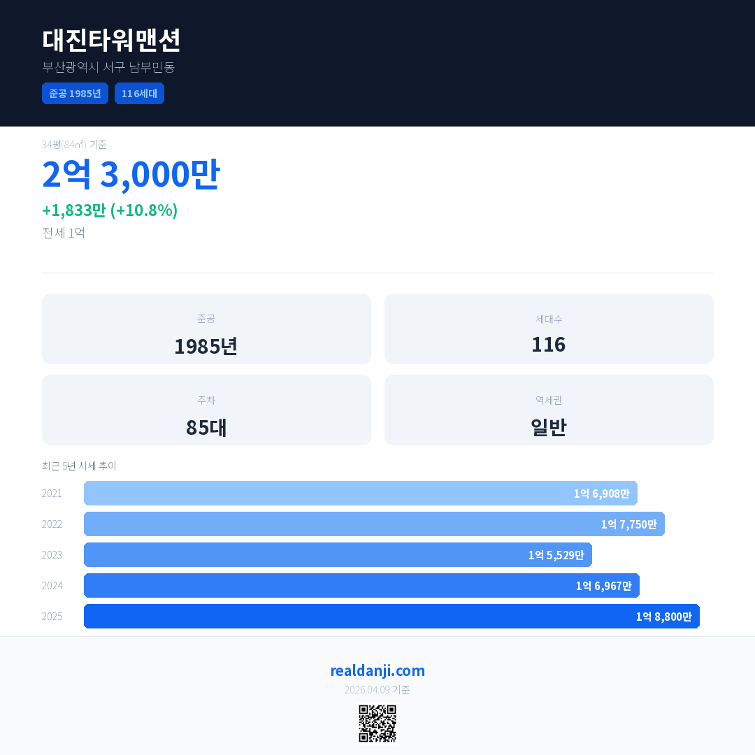 대진타워맨션 최근 거래가는 2억 3,000만입니다. (2025-11)