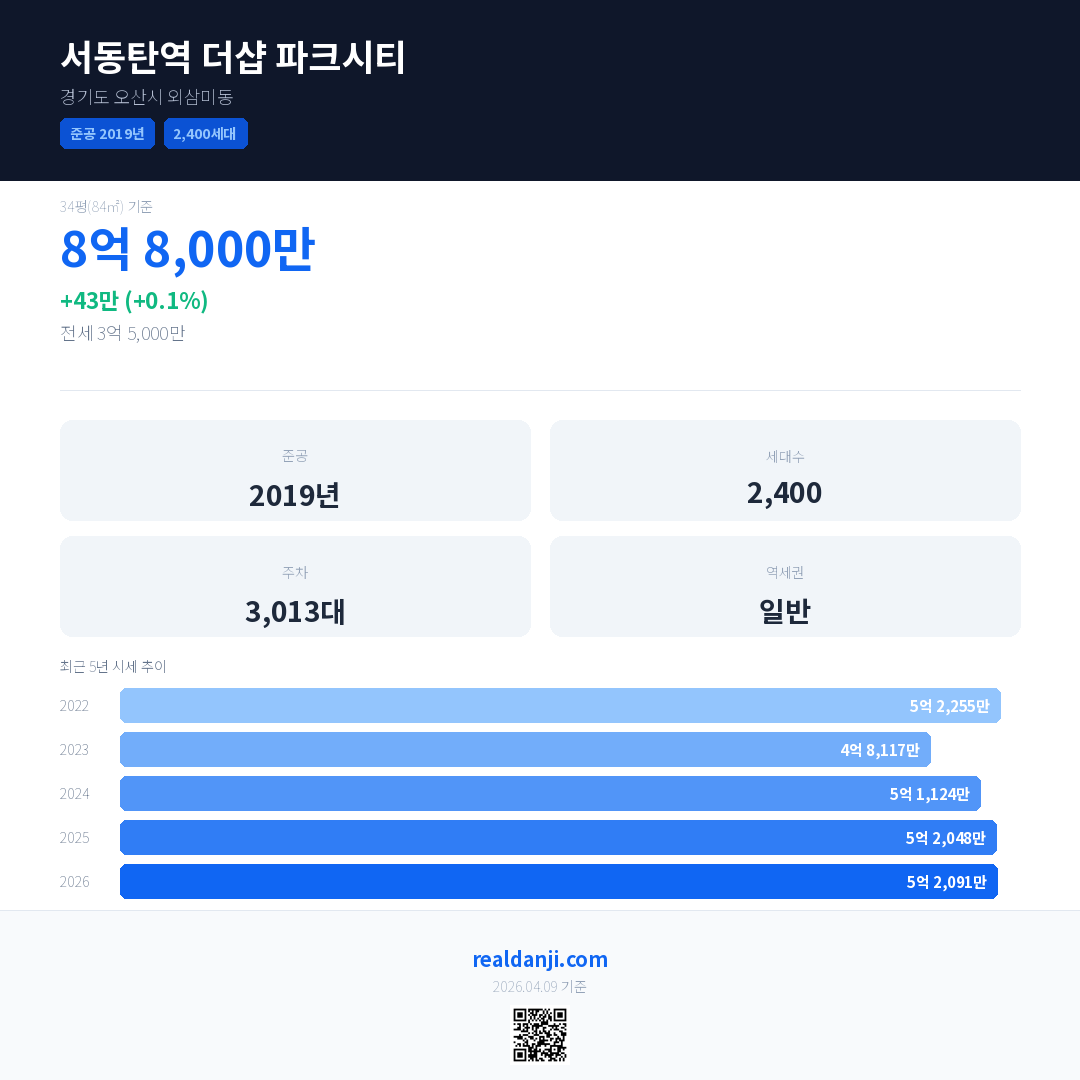 서동탄역 더샵 파크시티 국민평형 기준 2026년 평균 거래가는 5억 2,091만으로, 전년 대비 0.1% 상승 했습니다.