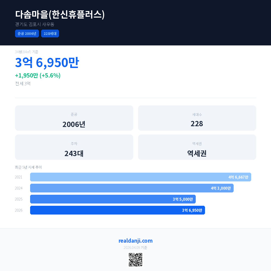 다솜마을(한신휴플러스) 국민평형 기준 2026년 평균 거래가는 3억 6,950만으로, 전년 대비 5.6% 상승 했습니다.