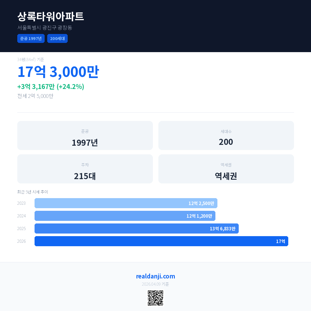 상록타워아파트 국민평형 기준 2026년 평균 거래가는 17억으로, 전년 대비 24.2% 상승 했습니다.