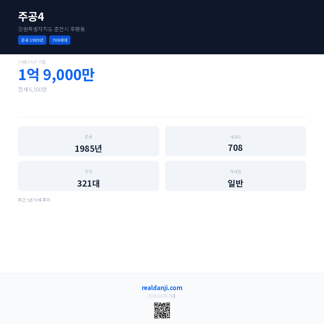 주공4은(는) 1985년에 준공되었으며, 현재 41년차입니다. 총 708세대 규모입니다.
