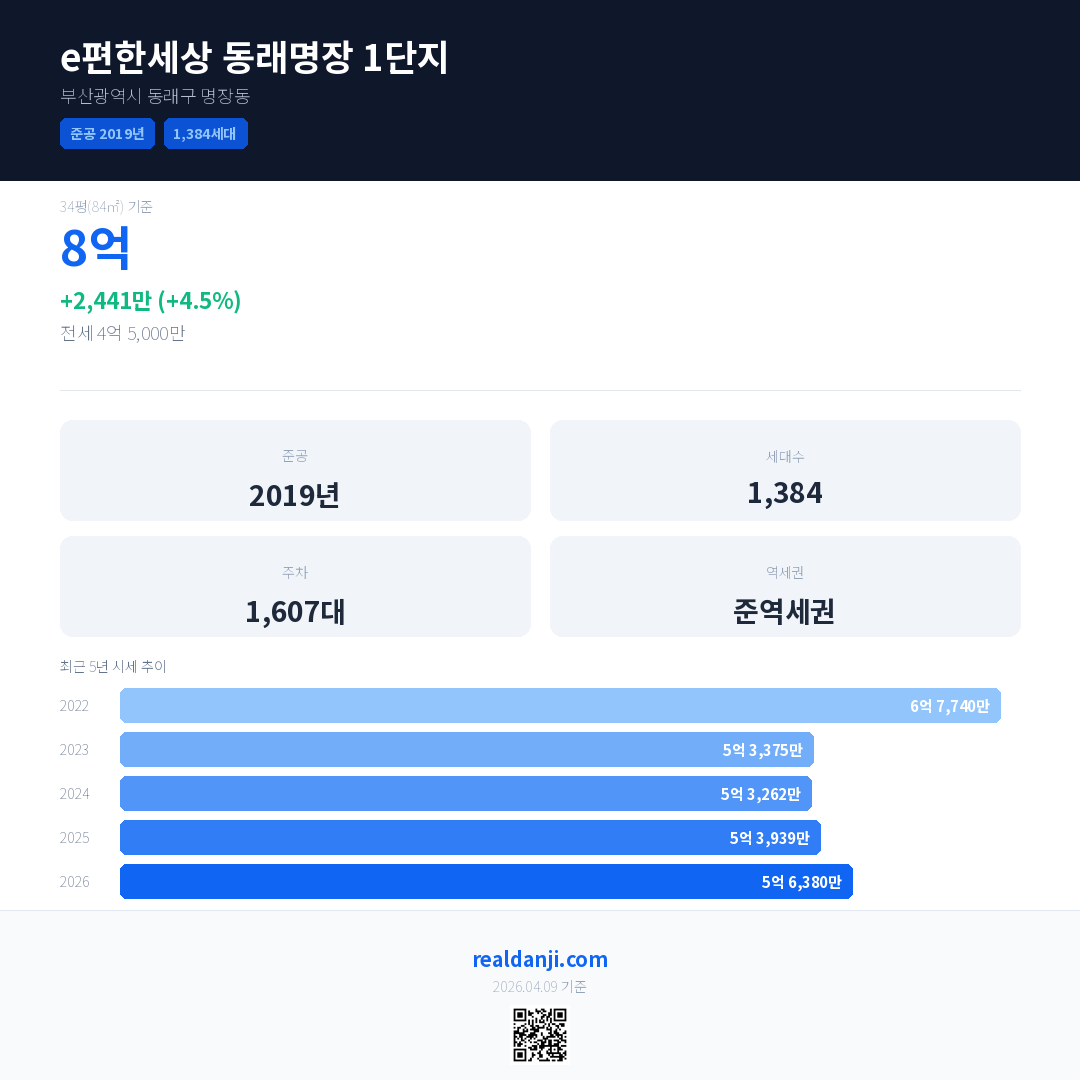 e편한세상 동래명장 1단지 최근 거래가는 8억입니다. (2026-04)