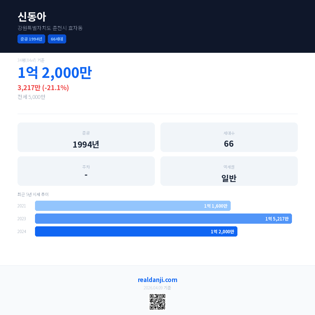 신동아은(는) 1994년에 준공되었으며, 현재 32년차입니다. 총 66세대 규모입니다.