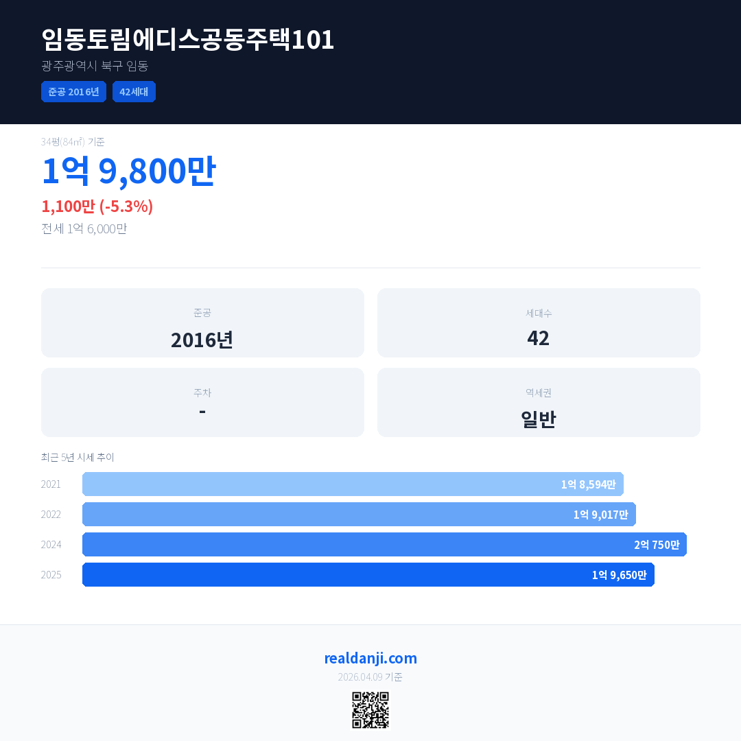 임동토림에디스공동주택101 국민평형 기준 2025년 평균 거래가는 1억 9,650만으로, 전년 대비 5.3% 하락 했습니다.