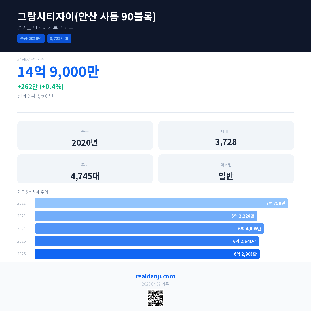 그랑시티자이(안산 사동 90블록) 국민평형 기준 2026년 평균 거래가는 6억 2,903만으로, 전년 대비 0.4% 상승 했습니다.