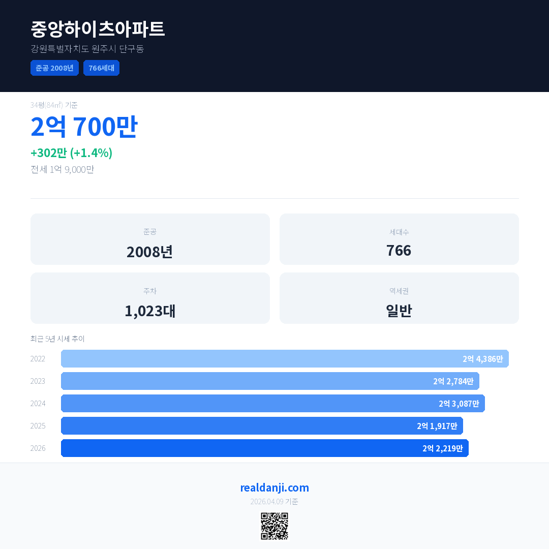 중앙하이츠아파트 국민평형 기준 2026년 평균 거래가는 2억 2,219만으로, 전년 대비 1.4% 상승 했습니다.