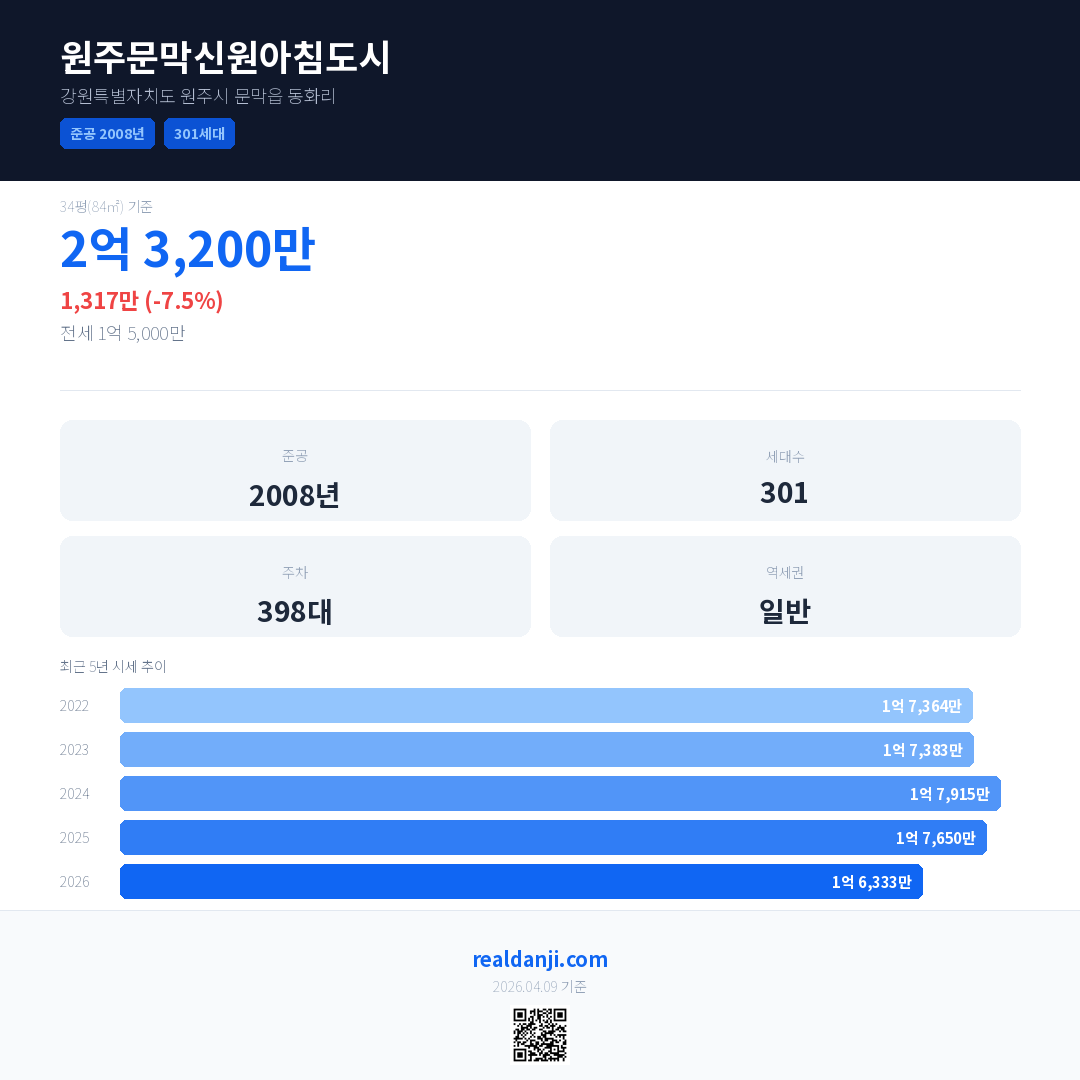 원주문막신원아침도시 최근 거래가는 2억 3,200만입니다. (2026-03)