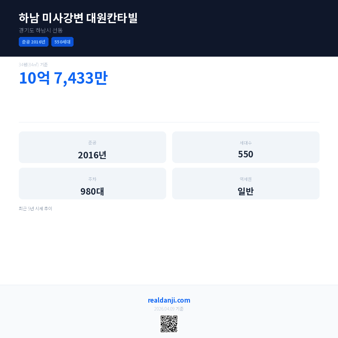 하남 미사강변 대원칸타빌은(는) 2016년에 준공되었으며, 현재 10년차입니다. 총 550세대 규모입니다.