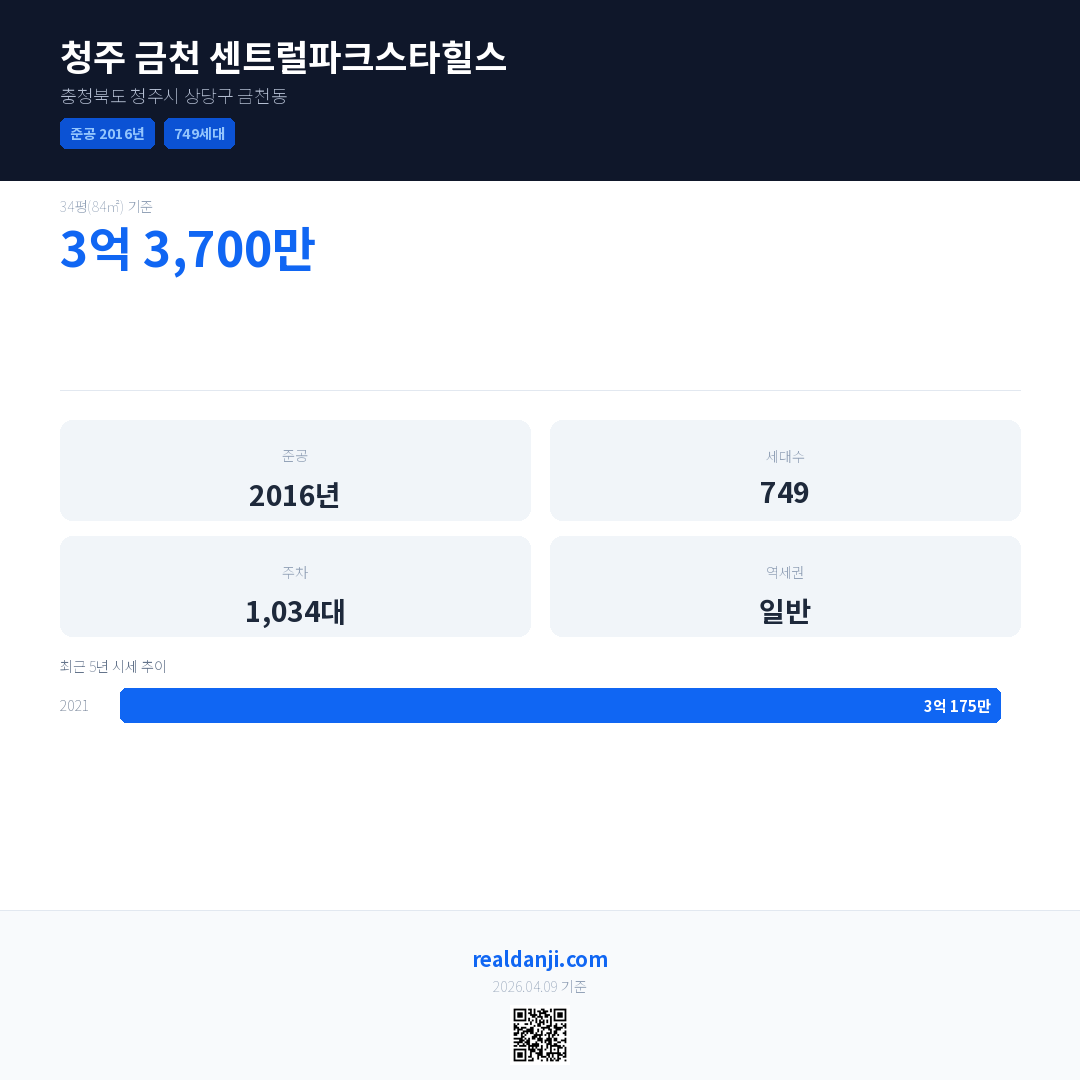 청주 금천 센트럴파크스타힐스 최근 거래가는 3억 3,700만입니다. (2021-02)
