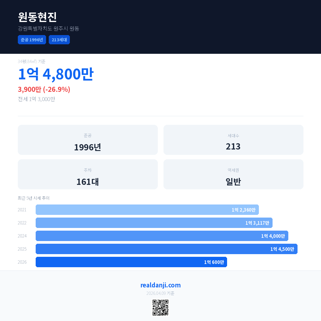 원동현진 국민평형 기준 2026년 평균 거래가는 1억 600만으로, 전년 대비 26.9% 하락 했습니다.