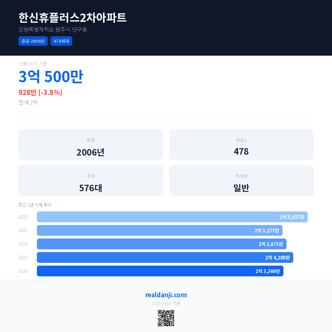 한신휴플러스2차아파트 최근 거래가는 3억 500만입니다. (2026-04)