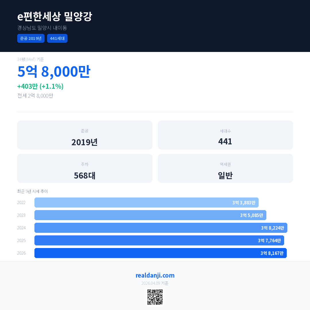 e편한세상 밀양강은(는) 2019년에 준공되었으며, 현재 7년차입니다. 총 441세대 규모입니다.