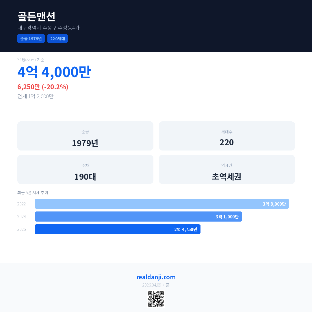 골든맨션 국민평형 기준 2025년 평균 거래가는 2억 4,750만으로, 전년 대비 20.2% 하락 했습니다.