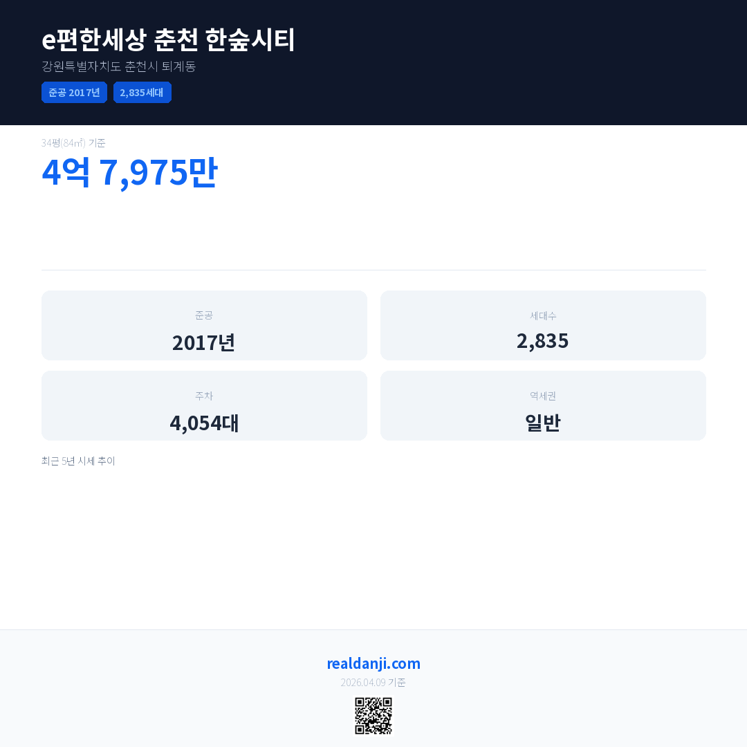 e편한세상 춘천 한숲시티은(는) 2017년에 준공되었으며, 현재 9년차입니다. 총 2,835세대 규모입니다.