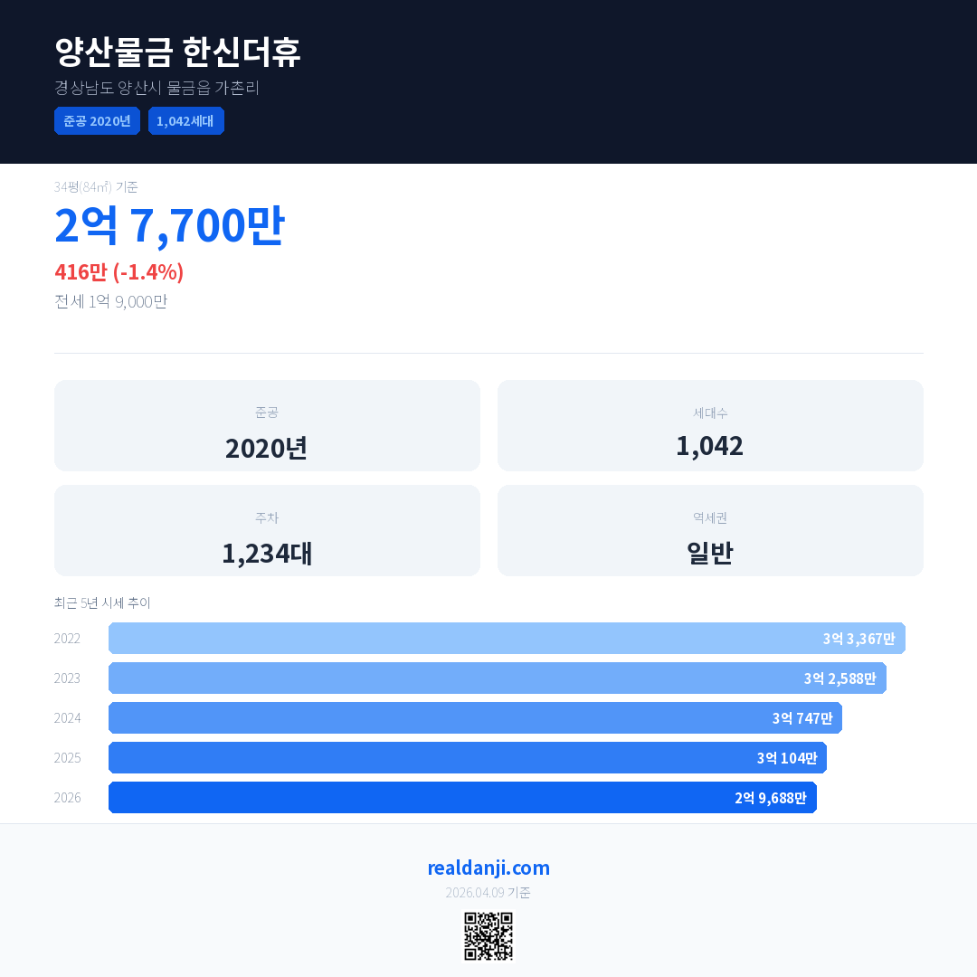 양산물금 한신더휴은(는) 2020년에 준공되었으며, 현재 6년차입니다. 총 1,042세대 규모입니다.