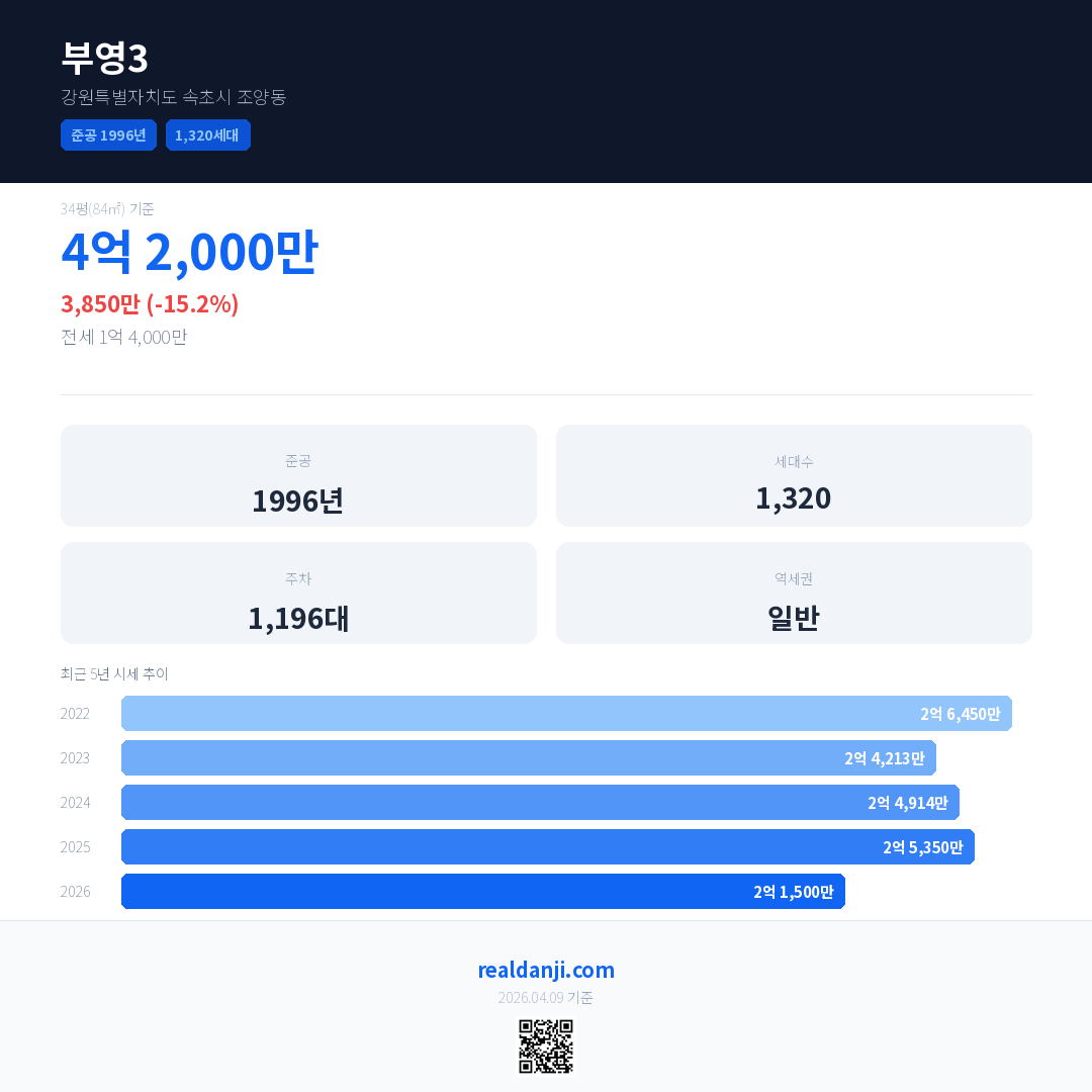 부영3 국민평형 기준 2026년 평균 거래가는 2억 1,500만으로, 전년 대비 15.2% 하락 했습니다.