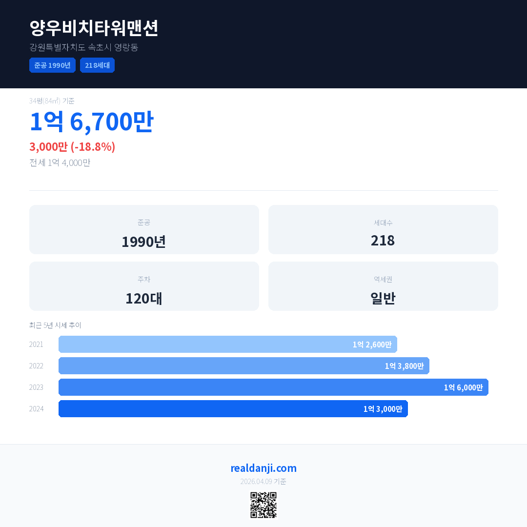 양우비치타워맨션 최근 거래가는 1억 9,000만입니다. (2026-03)