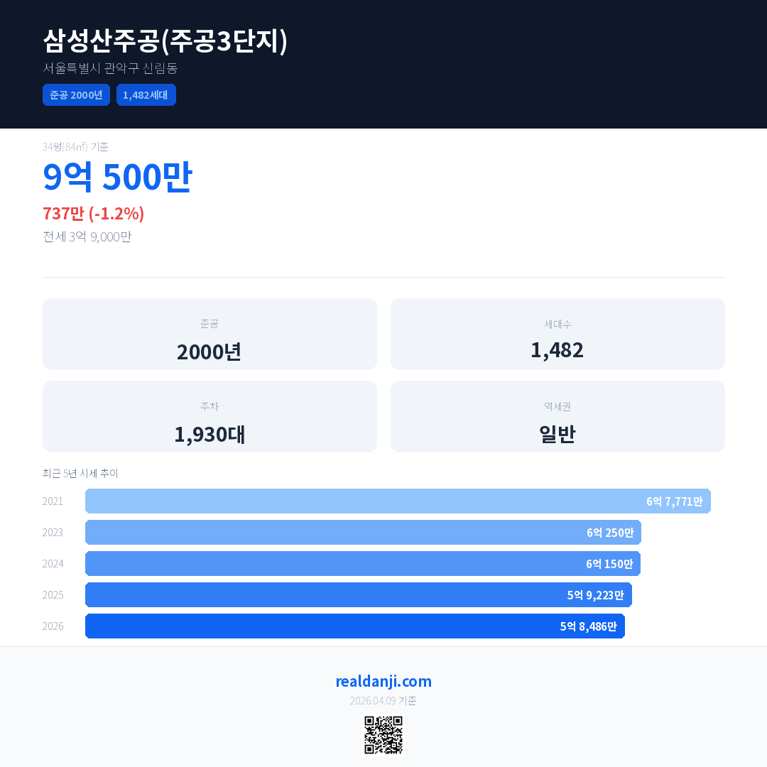 삼성산주공(주공3단지) 국민평형 기준 2026년 평균 거래가는 5억 8,486만으로, 전년 대비 1.2% 하락 했습니다.