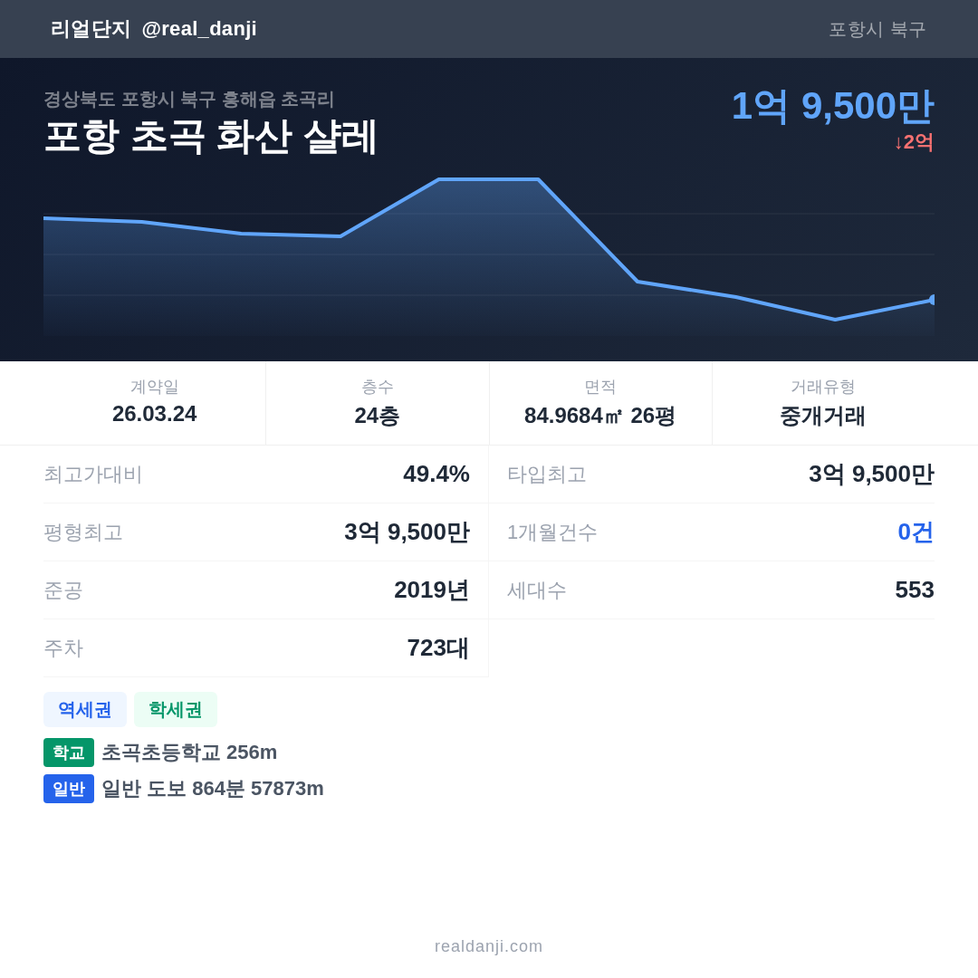 포항 초곡 화산 샬레 최근 거래가는 3억 9,500만입니다. (2026-03)