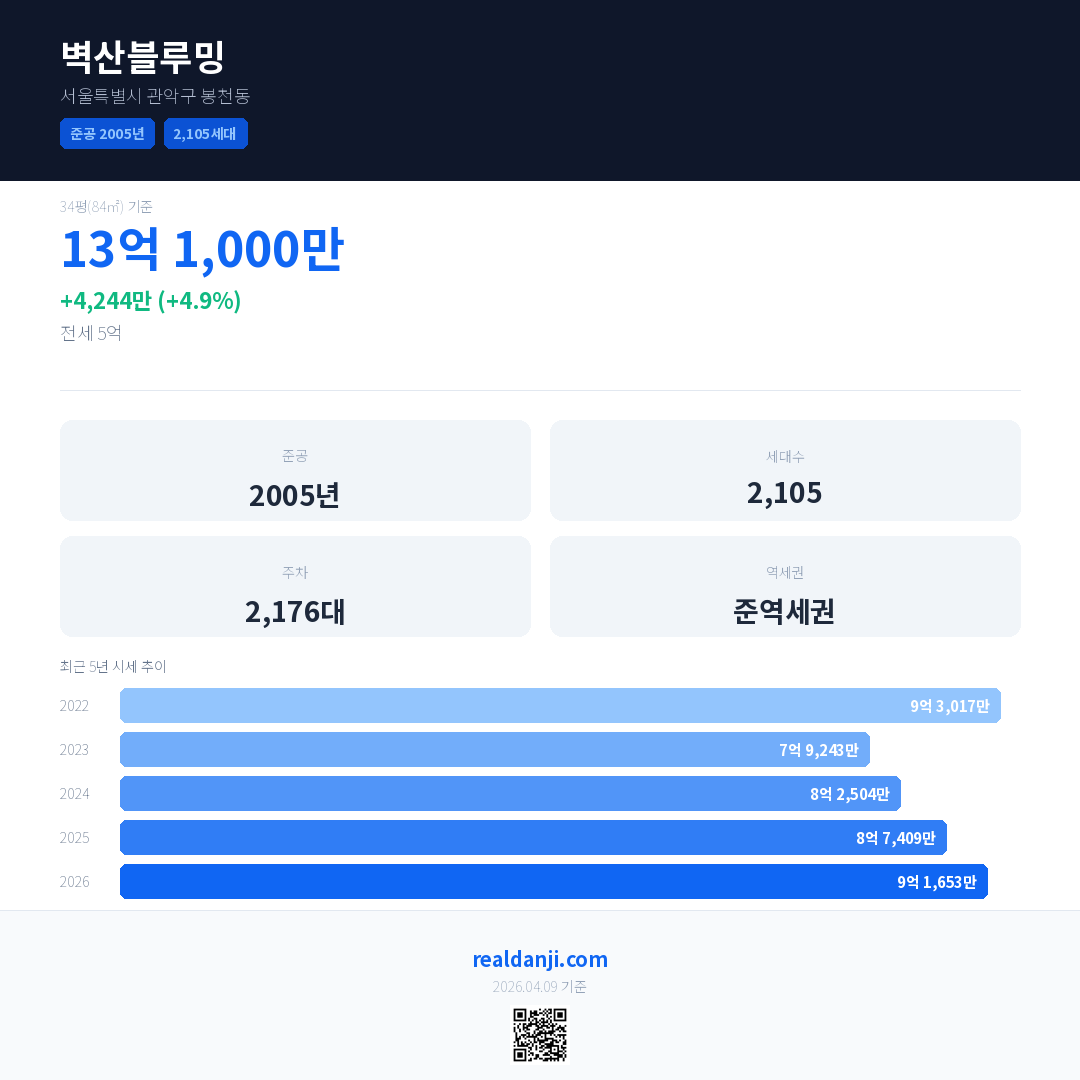 벽산블루밍 국민평형 기준 2026년 평균 거래가는 9억 1,653만으로, 전년 대비 4.9% 상승 했습니다.
