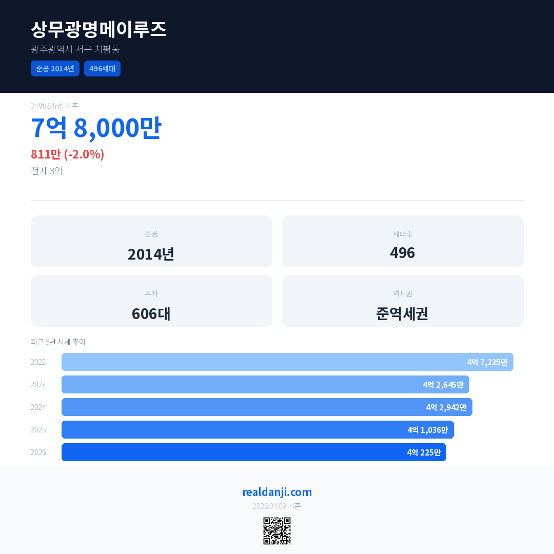 상무광명메이루즈 국민평형 기준 2026년 평균 거래가는 4억 225만으로, 전년 대비 2.0% 하락 했습니다.