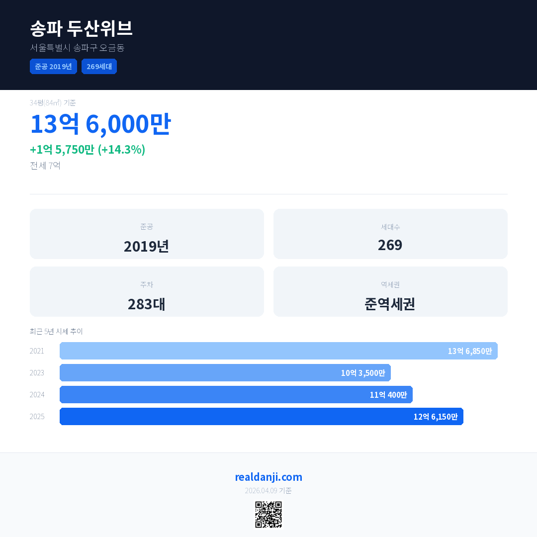 송파 두산위브 국민평형 기준 2025년 평균 거래가는 12억 6,150만으로, 전년 대비 14.3% 상승 했습니다.