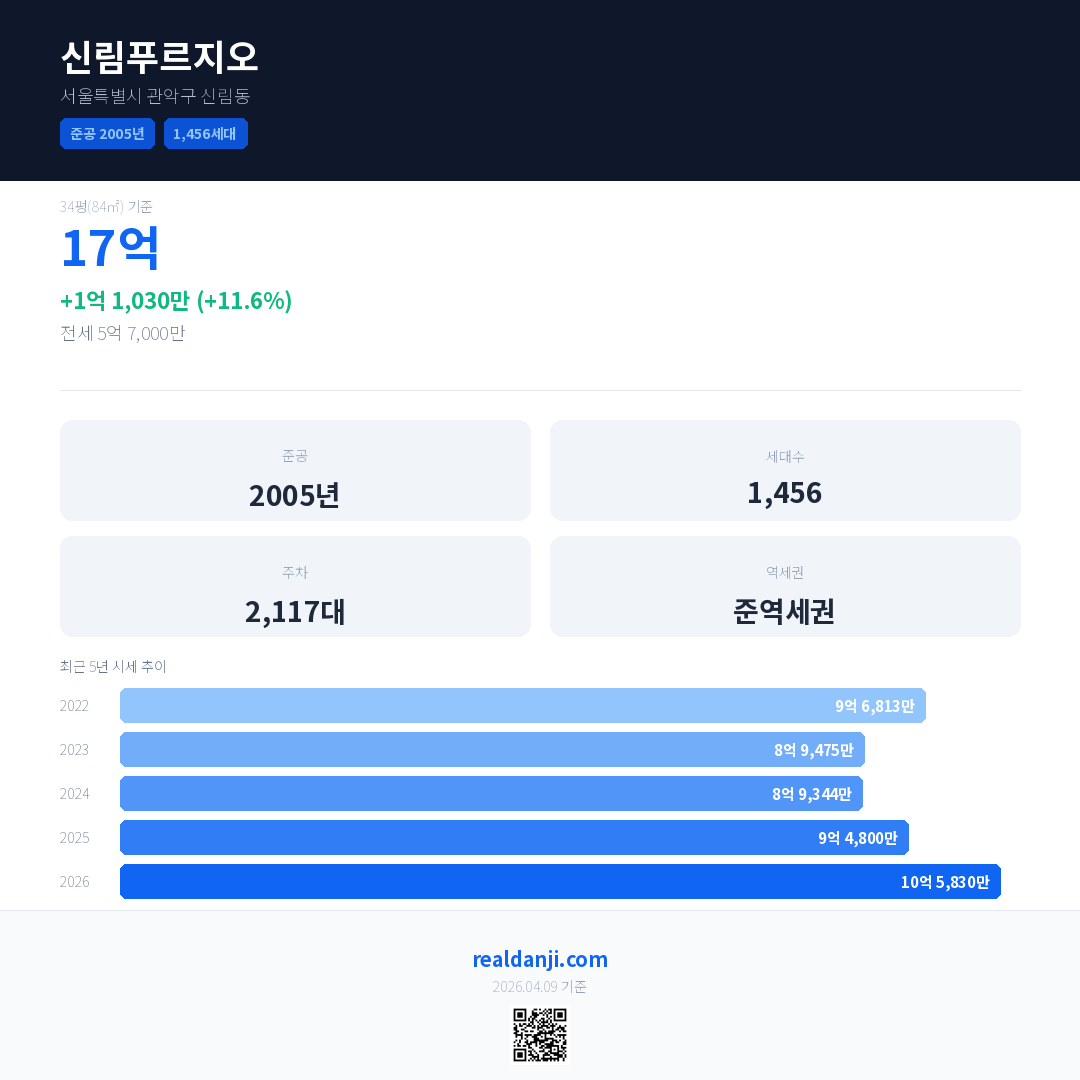 신림푸르지오은(는) 2005년에 준공되었으며, 현재 21년차입니다. 총 1,456세대 규모입니다.