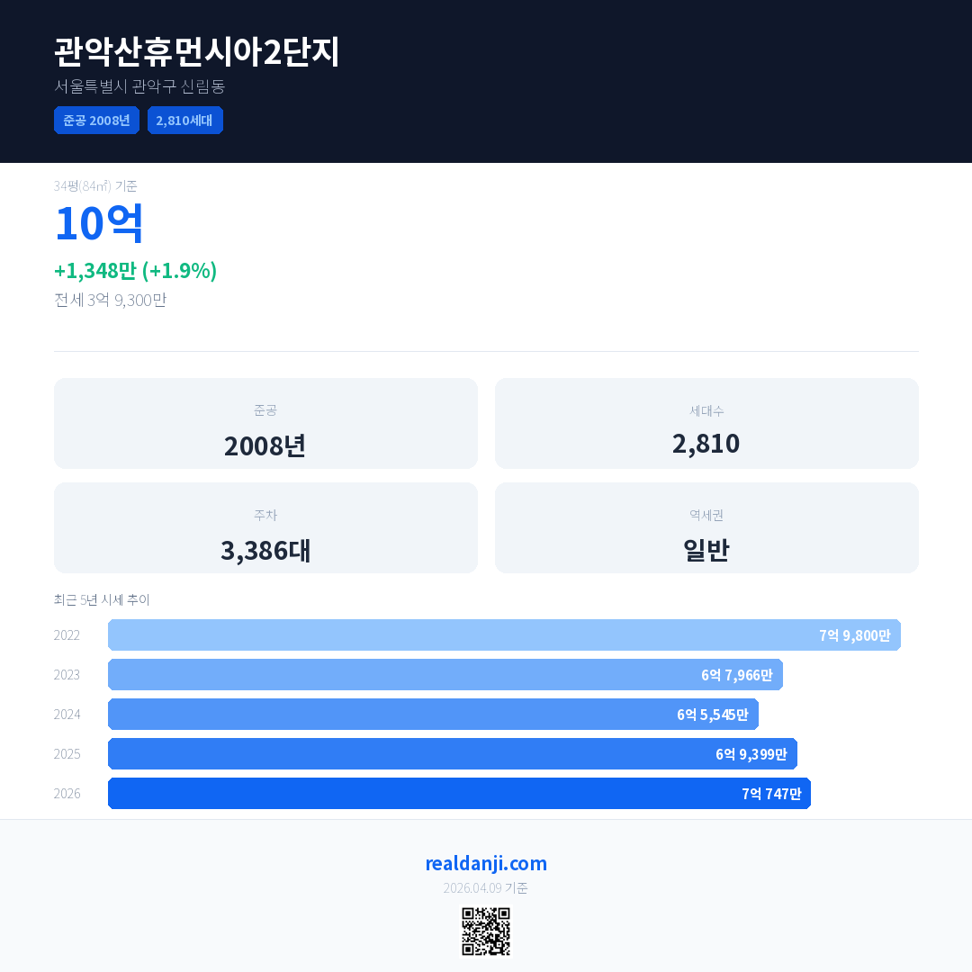 관악산휴먼시아2단지 국민평형 기준 2026년 평균 거래가는 7억 747만으로, 전년 대비 1.9% 상승 했습니다.