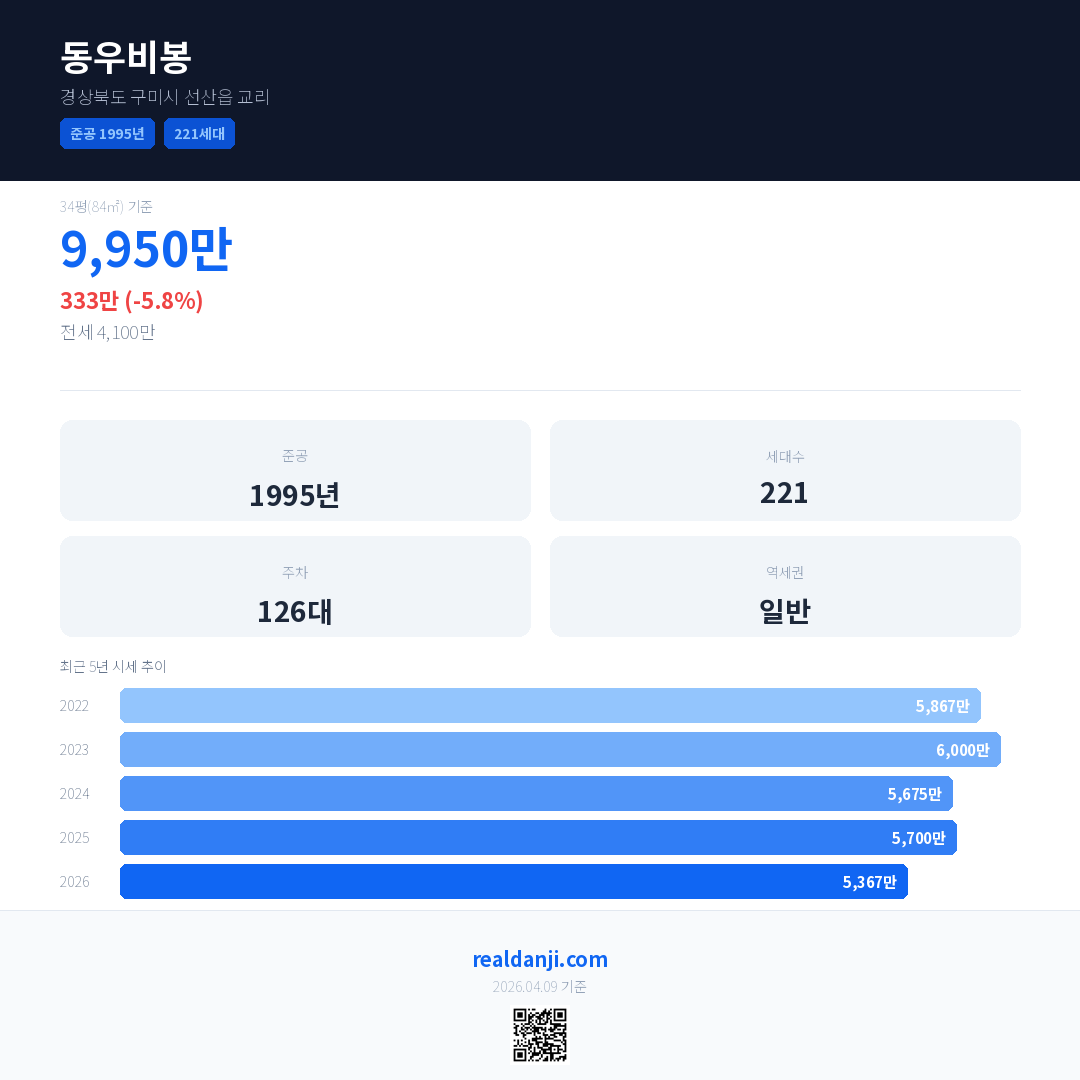 동우비봉 최근 거래가는 9,950만입니다. (2026-03)