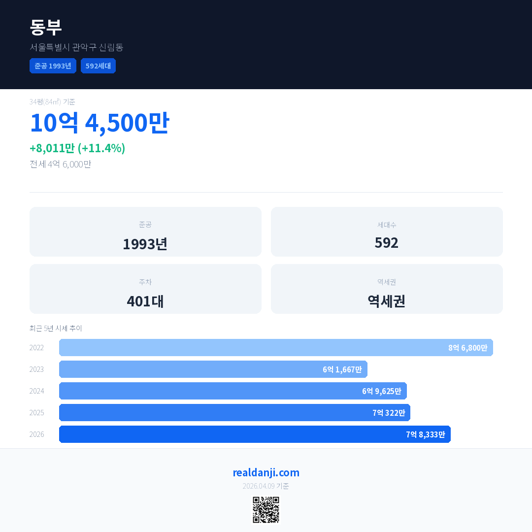 동부은(는) 1993년에 준공되었으며, 현재 33년차입니다. 총 592세대 규모입니다.