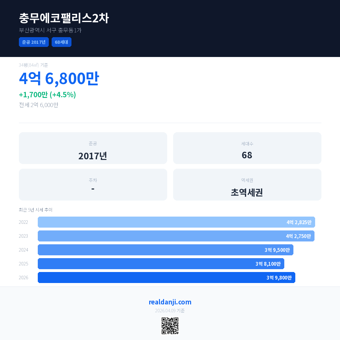 충무에코팰리스2차 최근 거래가는 4억 6,800만입니다. (2026-03)