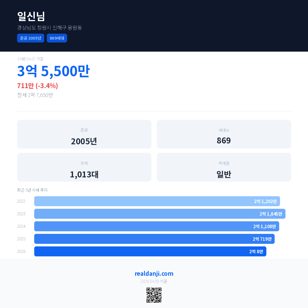 일신님 국민평형 기준 2026년 평균 거래가는 2억 8만으로, 전년 대비 3.4% 하락 했습니다.