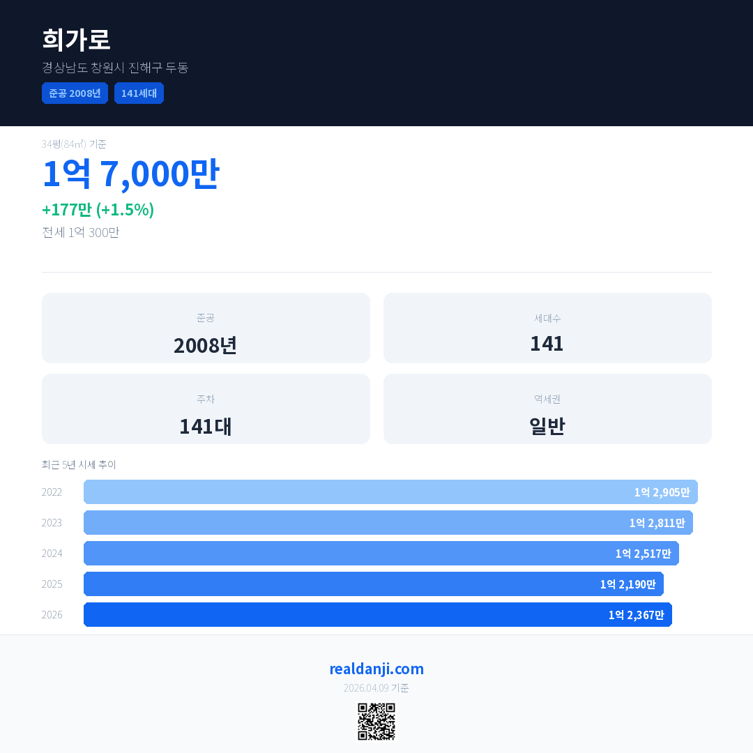 희가로 국민평형 기준 2026년 평균 거래가는 1억 2,367만으로, 전년 대비 1.5% 상승 했습니다.