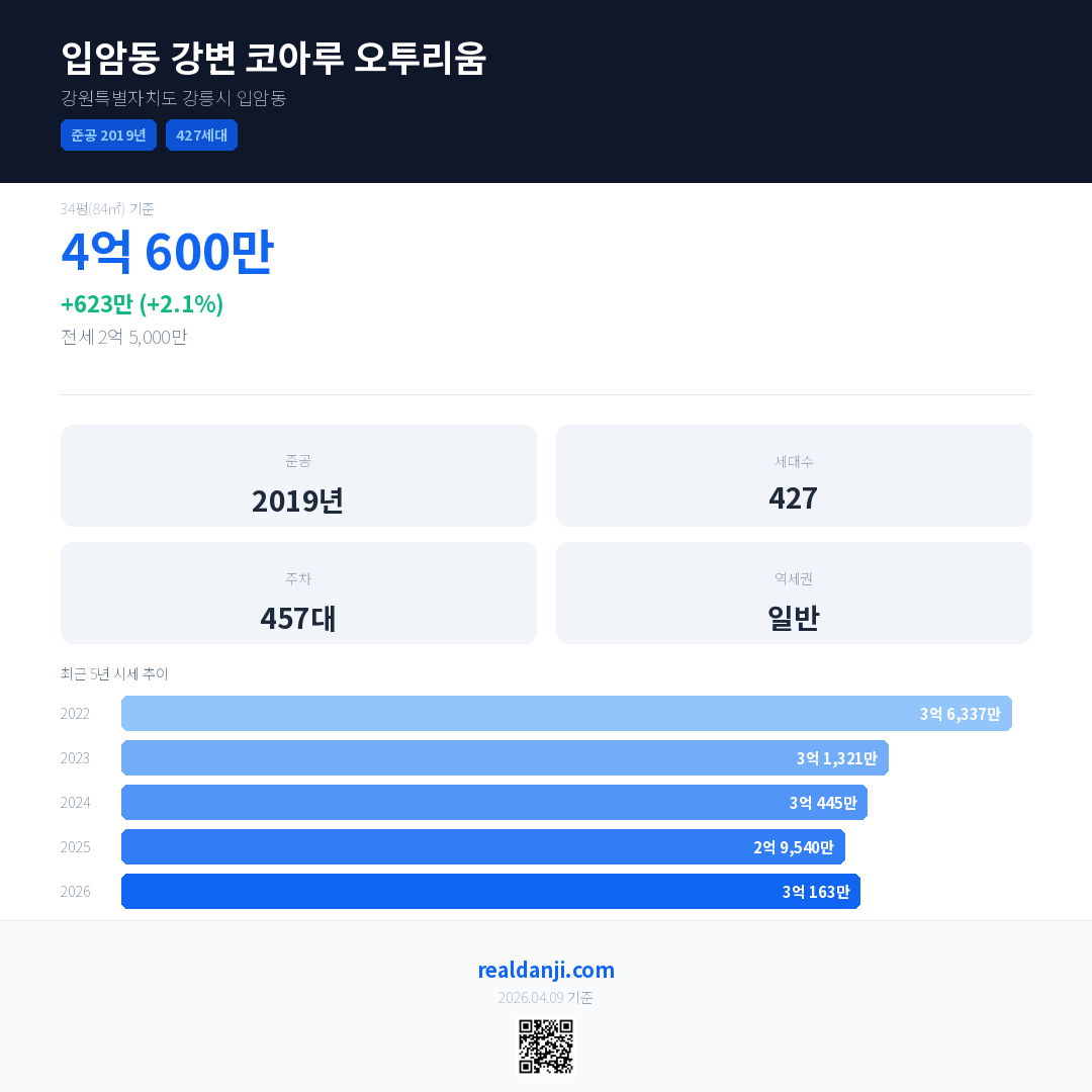 입암동 강변 코아루 오투리움 국민평형 기준 2026년 평균 거래가는 3억 163만으로, 전년 대비 2.1% 상승 했습니다.