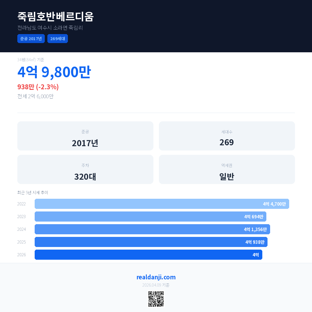 죽림호반베르디움 최근 거래가는 4억 9,800만입니다. (2026-03)