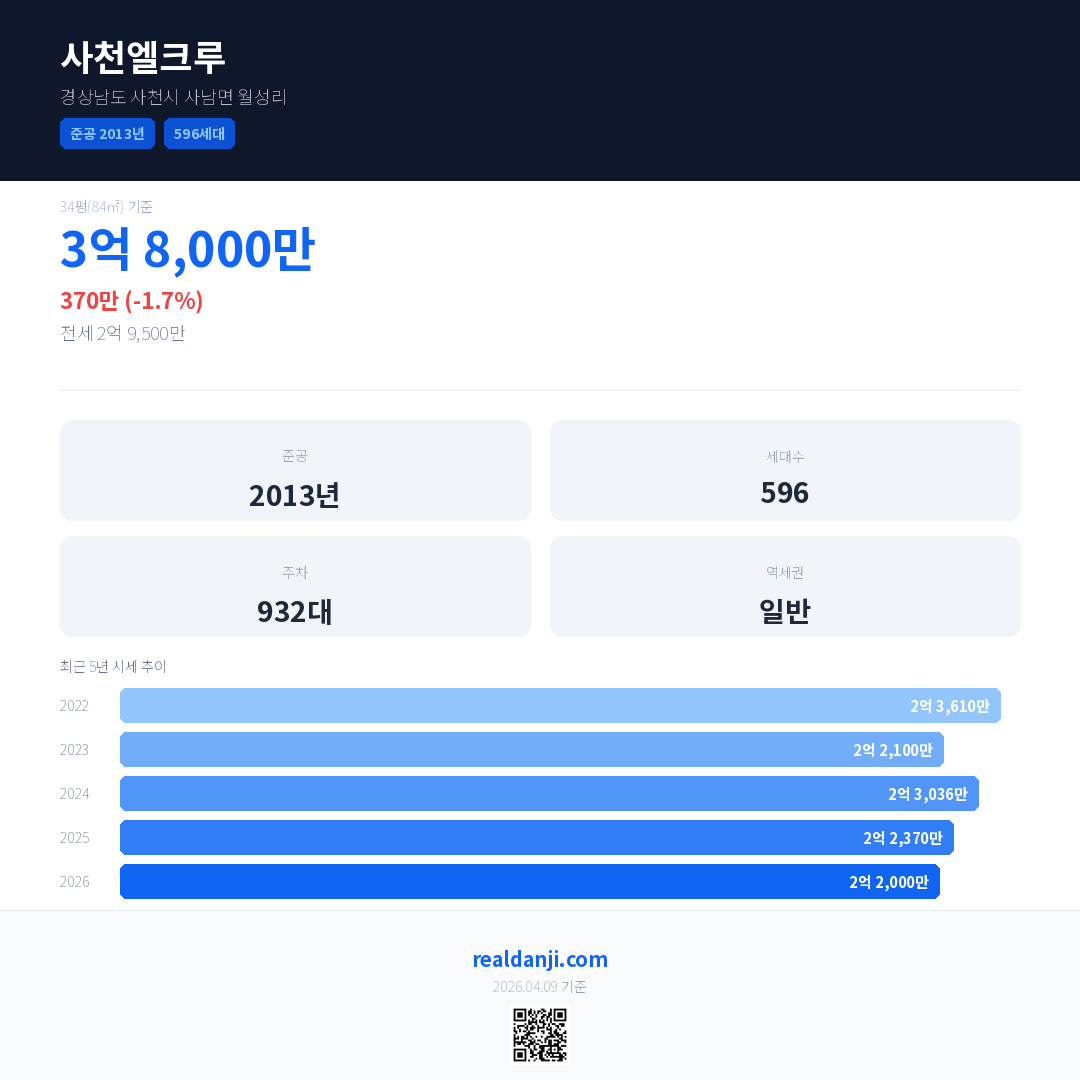 사천엘크루 최근 거래가는 2억 6,000만입니다. (2026-04)
