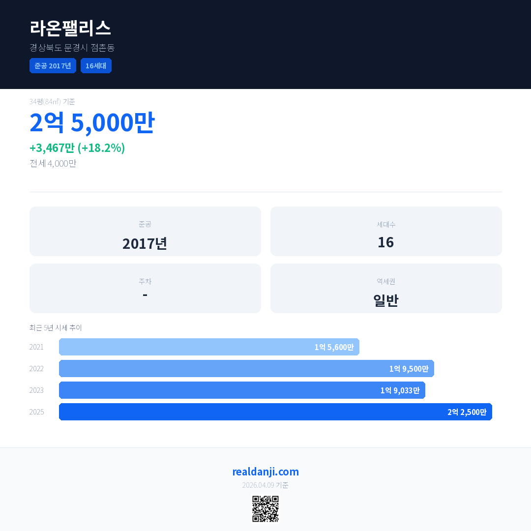 라온팰리스 국민평형 기준 2025년 평균 거래가는 2억 2,500만으로, 전년 대비 18.2% 상승 했습니다.