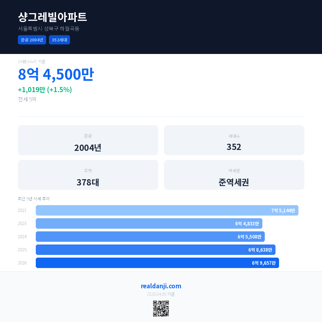 샹그레빌아파트 국민평형 기준 2026년 평균 거래가는 6억 9,657만으로, 전년 대비 1.5% 상승 했습니다.