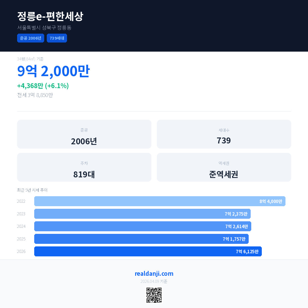 정릉e-편한세상 국민평형 기준 2026년 평균 거래가는 7억 6,125만으로, 전년 대비 6.1% 상승 했습니다.