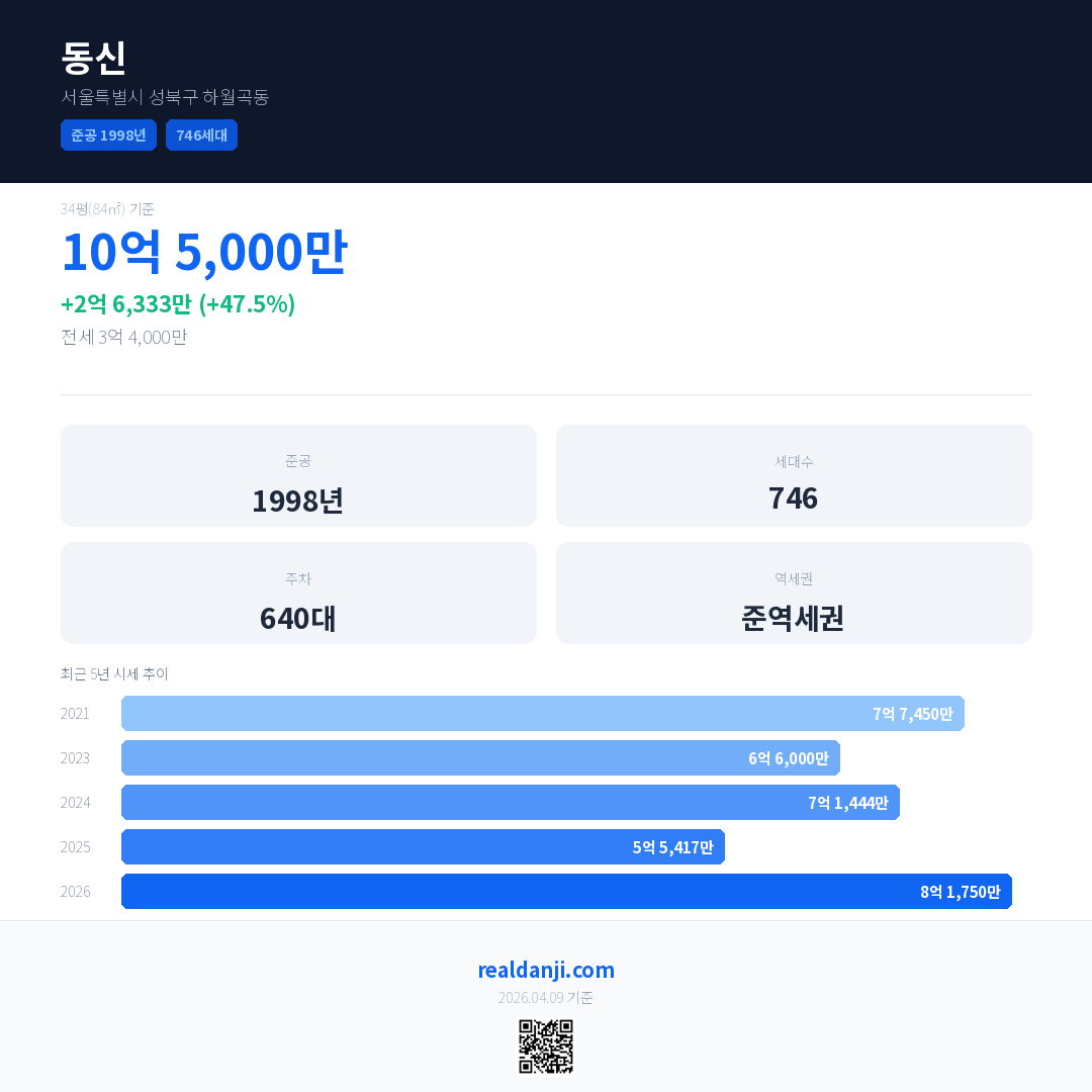 동신 국민평형 기준 2026년 평균 거래가는 8억 1,750만으로, 전년 대비 47.5% 상승 했습니다.