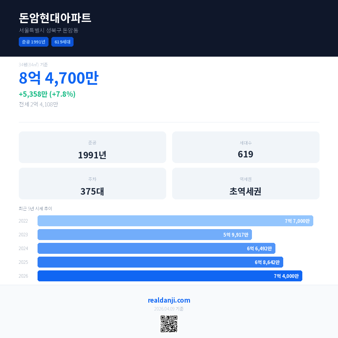 돈암현대아파트 국민평형 기준 2026년 평균 거래가는 7억 4,000만으로, 전년 대비 7.8% 상승 했습니다.