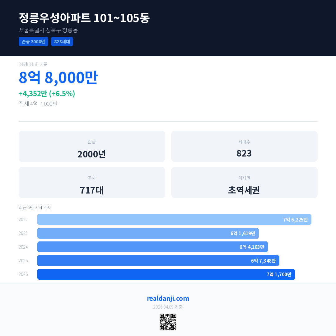 정릉우성아파트 101~105동 국민평형 기준 2026년 평균 거래가는 7억 1,700만으로, 전년 대비 6.5% 상승 했습니다.